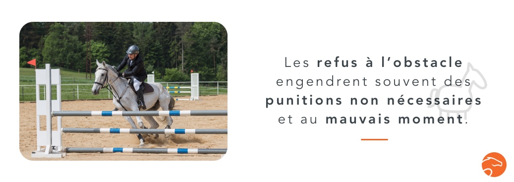 Si vous n’avez pas le temps de punir le cheval (cavalier déséquilibré suite au refus), mieux vaut ne rien faire, re-franchir l’obstacle, et renforcer positivement à la réception (gratouillis au garrot par exemple).