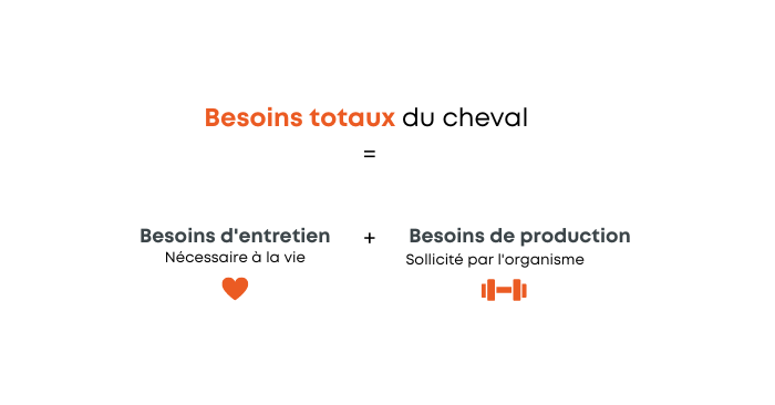 ⏩ Lorsque l’organisme est fortement sollicité (travail musculaire du cheval de sport, croissance du jeune, gestation et lactation de la poulinière), les besoins nutritionnels augmentent. On parle alors de besoins de production. Ils viennent s’additionner aux besoins d’entretien.