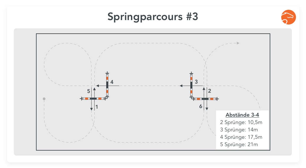 Diese Übung ist sehr interessant, da du an der Taktreinheit während des ganzen Springparcours arbeiten musst. Die Abstände zwischen den Hindernissen sind immer die gleichen. Du solltest also immer die gleiche Anzahl von Galoppsprüngen zwischen jedem Sprung reiten, um deinen Takt rein zu halten.