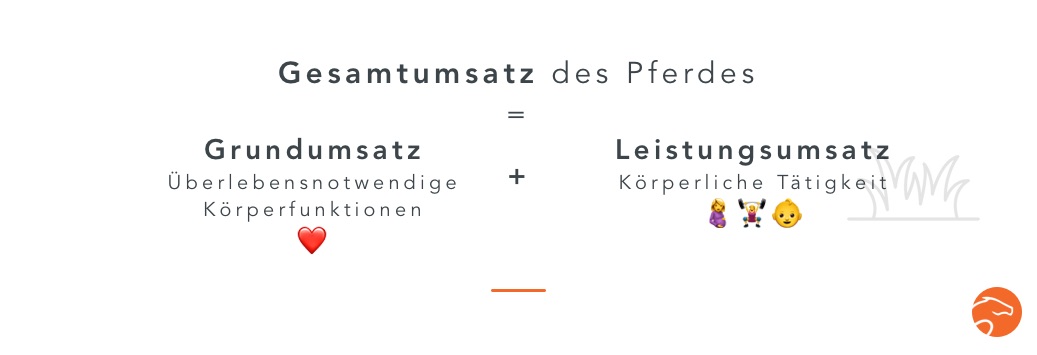 ⏩ Der Grundumsatz bezeichnet die Energie, die das Pferd benötigt, um lebenswichtige Körperfunktionen wie Atmung, Verdauung, Ausscheidung, Thermoregulation, Organfunktionen etc. aufrechtzuerhalten. Er hängt von verschiedenen Faktoren ab, wie z.B. vom Gewicht, körperlichen und gesundheitlichen Zustand, Geschlecht, Temperament und auch äußeren Umweltfaktoren wie dem Klima etc.