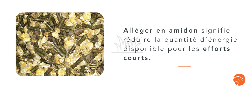 Man sollte hierbei nicht nur den Anteil an Stärke in einem bestimmten Futtermittel in Betracht ziehen, sondern die Gesamtmenge einer Ration. Die einzige wichtige Angabe ist also die Menge an Stärke pro Tag und pro Mahlzeit! Studien haben gezeigt, dass unter 2 Gramm (g) Stärke pro Kilogramm (kg) Lebendmasse (LM) pro Tag (d. h. 1000 g/Tag bei einem Pferd von 500 kg) und unter 1 Gramm Stärke pro Kilogramm Lebendmasse pro Mahlzeit das Risiko für die oben genannten Erkrankungen senkt [2]. Bei einem prädisponiertem Pferd kann diese Menge durch zwei geteilt werden! Diese Vorsichtsmaßnahme ist sehr gut mittels vieler “klassischer” Futtermittel auf dem Markt zu treffen.