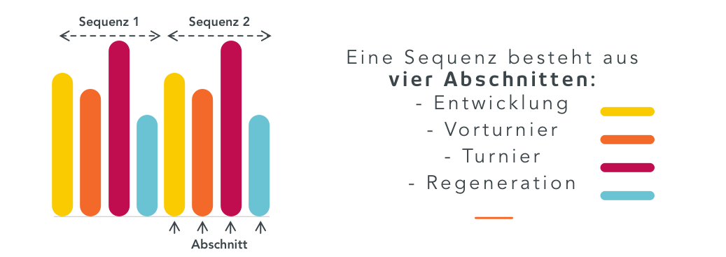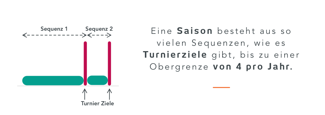 Tatsächlich ist eine Saison, also ein Jahr, in Sequenzen unterteilt. Es gibt so viele Sequenzen wie es Turnierziele gibt. Ich spreche nicht von den kleinen Sonntagswettbewerben, sondern von den großen Turniere (wie einem 3-Tage-Turnier). Stellen wir uns vor, du hast ein großes Turnier im Mai und die französischen Meisterschaften im Juli geplant. Deine Saison wird in 2 Sequenzen unterteilt. Wir setzen das Limit von 4 großen Zielen in einer Saison, also maximal 4 Sequenzen im Jahr.