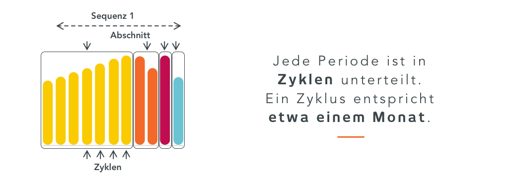 Jede Sequenz wird in 4 Abschnitte unterteilt und die Intensität der Arbeit und die Dauer der Einheiten werden sich entwickeln.