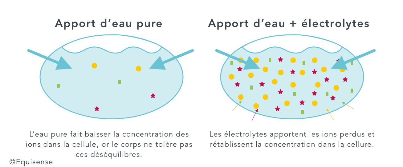 Si le cheval boit beaucoup d’eau pure (dépourvue d’électrolytes / d’ions), ça va faire baisser encore plus la concentration dans les cellules. Or le corps cherche systématiquement à maintenir une même concentration de part et d’autre de la membrane de la cellule. Du coup si la cellule a diminué sa concentration en ions, le fait d’apporter de l’eau pure en masse ne fera qu’aggraver la situation.