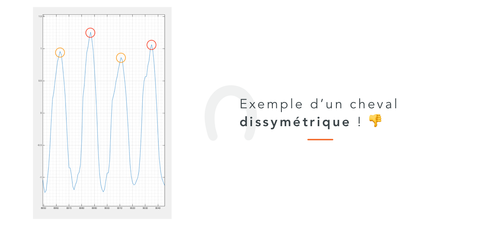 Sur ce cheval, le diagonal orange est systématiquement plus faible que le diagonal rouge. Ce cheval est donc dissymétrique.