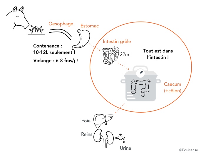 Le cheval est un monogastrique (il n’a qu’un estomac d’un seul tenant, comme nous) herbivore qui présente une anatomie digestive bien spécifique. Il a un estomac de petite taille et un gros intestin très développé. La digestion est sommaire dans cet estomac. Elle s’intensifie dans l’intestin grêle grâce à des enzymes digestives, puis dans le gros intestin grâce à la flore bactérienne digestive.