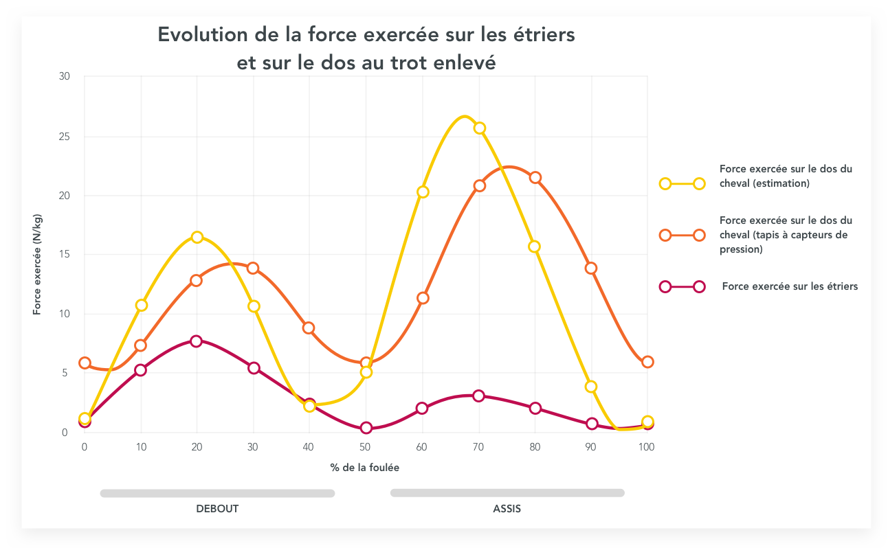 En fait, lorsque le cavalier est en phase « assis », il met une plus grande force sur le dos de son cheval que lorsqu’il est en phase « debout » [1].