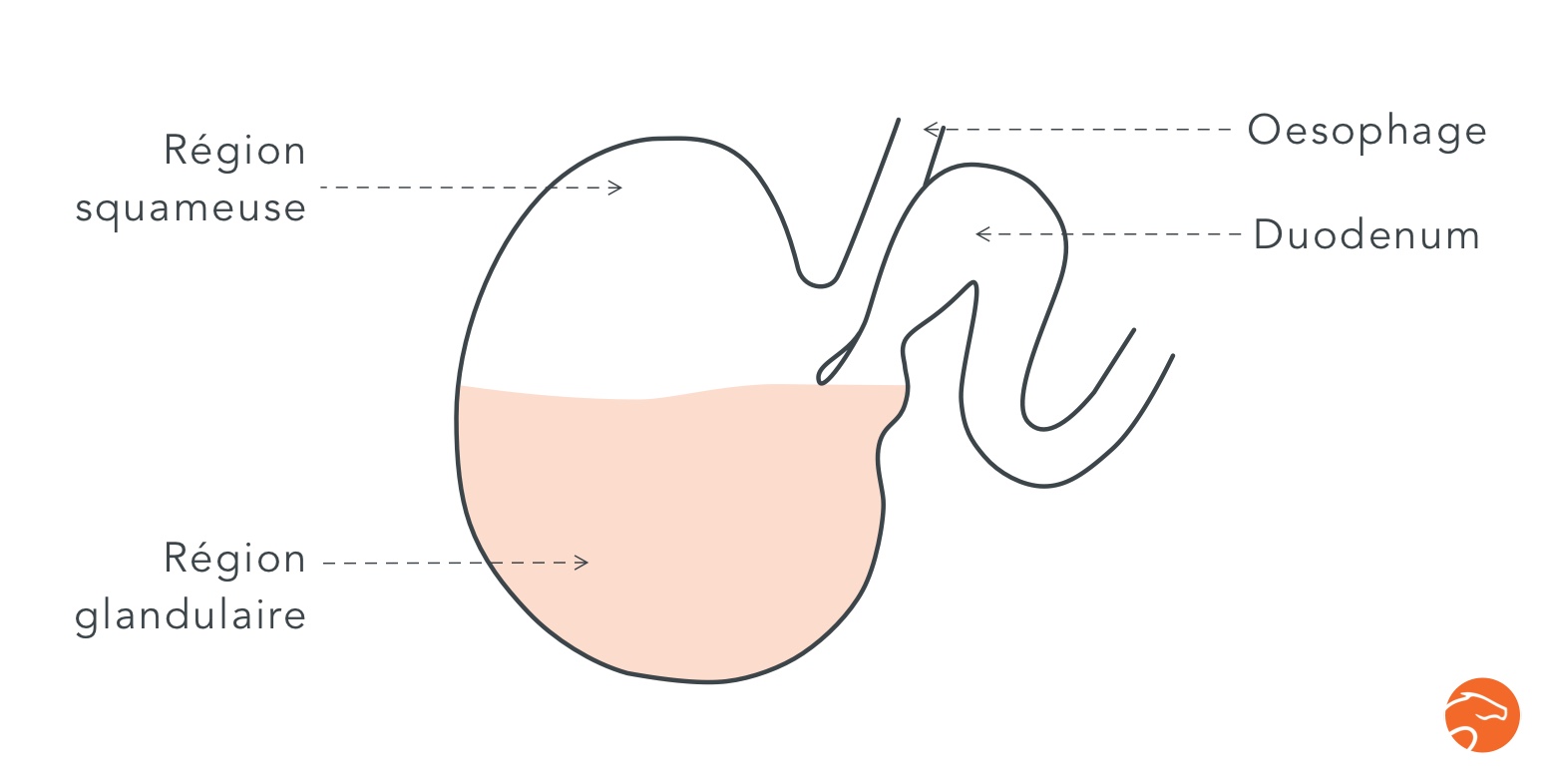 En revanche, la muqueuse squameuse (celle du haut) est moins bien pourvue. Le maintien de son intégrité est donc complètement dépendant de son exposition limitée au contenu acide. Or, les contraintes liées à la domestication et à l’utilisation du cheval pour le sport influencent la régulation et l’impact de cet acide gastrique sur les parois de l’estomac, notamment de la muqueuse squameuse (celle du haut).